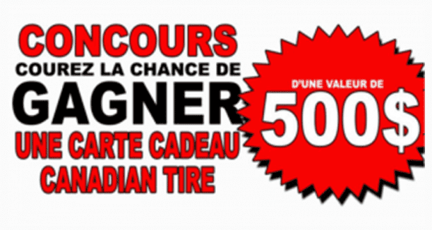4 chèques cadeaux Canadian Tire de 500$ chacun : Concours M105, C’est votre chance de gagner à tous les jours de semaine, des prix de 50 à 100 dollars… Et l’un des quatre chèques cadeaux Canadian Tire de Granby de 500$!