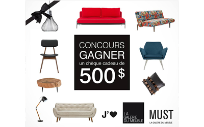 Concours gagnez un chèque cadeau La Galerie du Meuble de 500$ : Participez à ce jeu concours et courez la chance de gagner un chèque cadeau de 500$ échangeable dans l’un des deux magasins La Galerie du Meuble ainsi qu’à la Boutique MUST.