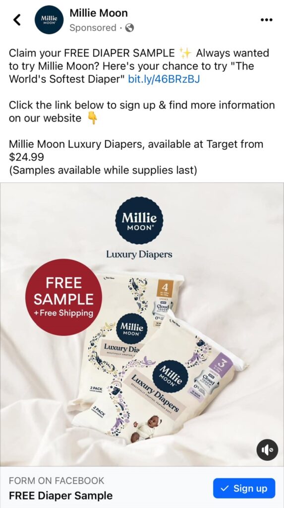 3 : Puis retournez checker votre fil d’actualités. Si vous faites partie des personnes dont le profil est ciblé par ce type de publicité sponsorisée, vous verrez le post de l’offre d’échantillon s’afficher sur votre fil très rapidement. Si vous ne voyez rien sous 5 jours, c’est que vous n’êtes pas concerné par le ciblage publicitaire commandité par Millie Moon.