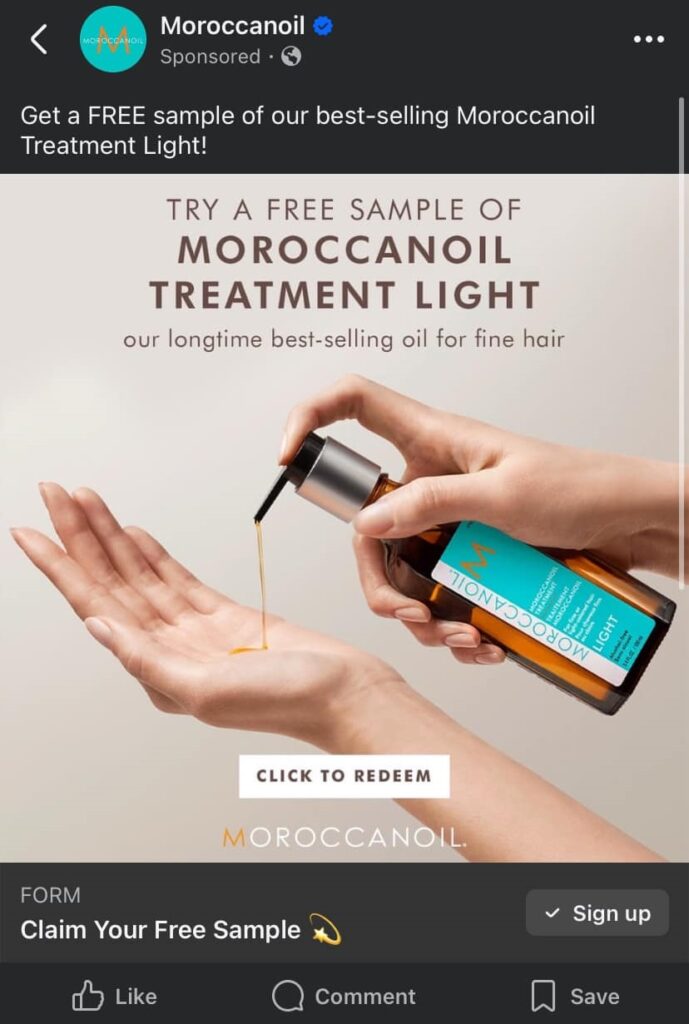 N’oubliez pas que les publications sponsorisées sont des publicités. Les marques payent pour apparaître sur des profils qu’elles ciblent. Pour ce genre de post, les marques ciblent essentiellement des profils féminins. Si votre profil fait partie du public ciblé par Moroccanoil, vous verrez le post de l’offre d »échantillon s’afficher sur votre fil. Si rien n’apparaît sous 5 jours, c’est que vous ne faites pas partie des personnes visées par cette publicité.