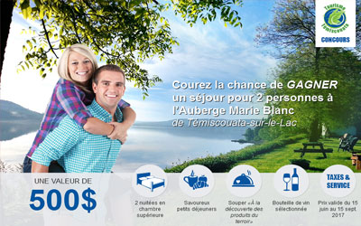 Forfait à l’Auberge Marie Blanc : Participez à ce jeu concours gratuit pour gagner un (1) forfait pour 2 personnes, d’une valeur de 500$, à l’Auberge Marie Blanc de Témiscouata-sur-le-Lac, comprenant :
