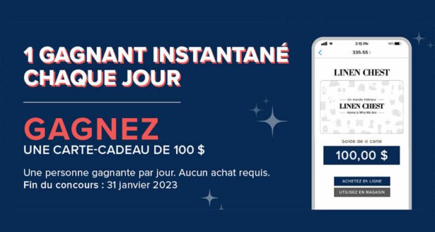 Gagnez 22 cartes-cadeaux Linen Chest de 100 $ : 22 grands prix seront décernés : carte-cadeau Linen Chest d’une valeur de 100,00 $
