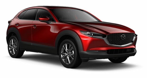 Un Mazda CX–30 GX de couleur rouge Crystal vibrant métallisé, neuf et d’une valeur d’environ 30 000 $.