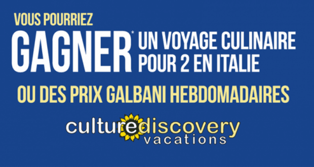 Gagnez un voyage pour deux à Soriano nel Cimino en Italie : Il y a un (1) grand prix à gagner constitué d’un voyage pour deux (2) en Italie (VMD : 12 500 $ CAN). Il y a aussi dix (10) prix hebdomadaires à gagner au début de la période du concours, chacun constitué d’un Ensemble de prix Galbani (VMD : 500 $ CAN chacun).